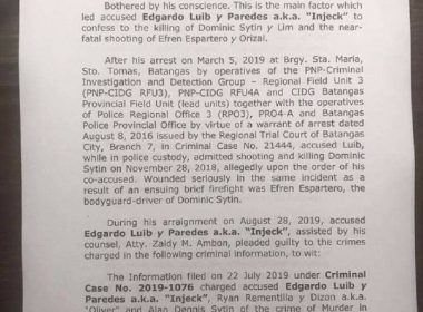(Eagle News) — An Olongapo court has sentenced to prison the man who confessed to the killing of businessman Dominic Sytin. Branch 72 Judge Richard Paradeza sentenced Edgardo Luib to the supreme penalty of reclusion perpetua for the killing, and to a minimum of six years, one month and 11 days of prision mayor up to a maximum of 12 years, five months and eleven days reclusion temporal for the near-fatal shooting of Sytin’s bodyguard-driver, […]