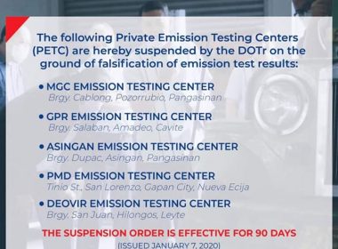 (Eagle News)–The Department of Transportation has suspended five emission test centers for alleged falsification of test results. In a statement, the DOTr said that, through the Investigation Security and Law Enforcement Staff, it issued a preliminary suspension order against: 1. MGC EMISSION TESTING CENTER in Brgy. Cablong, Pozorrubio, Pangasinan 2. GPR EMISSION TESTING CENTER in Brgy. Salaban, Amadeo, Cavite 3. ASINGAN EMISSION TESTING CENTER in Brgy. Dupac, Asingan, Pangasinan 4. PMD EMISSION TESTING CENTER in […]