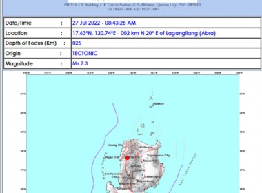 (Eagle News) – A magnitude 7.3 quake hit Abra that was also felt in several parts of Luzon on Wednesday morning, July 27, PHIVOLCS data showed. The quake was tectonic in origin. It was reported at intensity 4 in Quezon City. The epicenter of the quake was located at two kilometers northeast of Lagangilang, Abra, with a depth of 25 kilometers. It occurred at 8:43 a.m. on Wednesday, July 27. The United States Geological […]