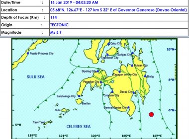 (Eagle News) – A magnitude 5.9 quake shook Davao Oriental early Wednesday morning, January 16, according to the latest data from the Philippine Institute of Volcanology and Seismology (PHIVOLCS) The quake had a depth of 114 kilometers and was of tectonic origin. Its epicenter was located at 127 kilometers southeast of Governor Generoso in Davao Oriental. PHIVOLCS said it is expecting aftershocks. It was reported at intensity 4 in Davao City and in San […]