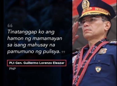 (Eagle News) — The new Philippine National Police (PNP) chief Lt. General Eleazar thanked President Rodrigo Duterte for choosing him to lead the 220,000 strong police force, as he acknowledged the “rare opportunity” to be appointed as PNP chief. “To be appointed as the Chief PNP is a rare opportunity, but come with the challenges of good leadership and meeting the high expectations of the Filipino people. I accept these challenges,” he said. “I […]