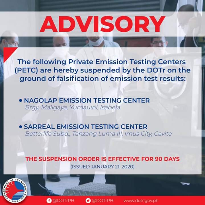 (Eagle News)---The Department of Transportation has suspended six private emission testing centers. In a Facebook post, the DOTr said the…