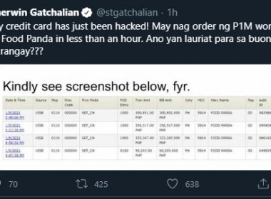 (Eagle News) — Senator Sherwin Gatchalian on Wednesday, January 6, said his credit card was hacked and used to purchase P1 million worth of food. “May nag order ng P1M worth of food sa Food Panda in less than an hour. Ano yan lauriat para sa buong barangay???” Gatchalian said in a Tweet. A screenshot attached by the senator in his Tweet showed the transactions were worth between P96,265 and P356,517. The transactions were done […]