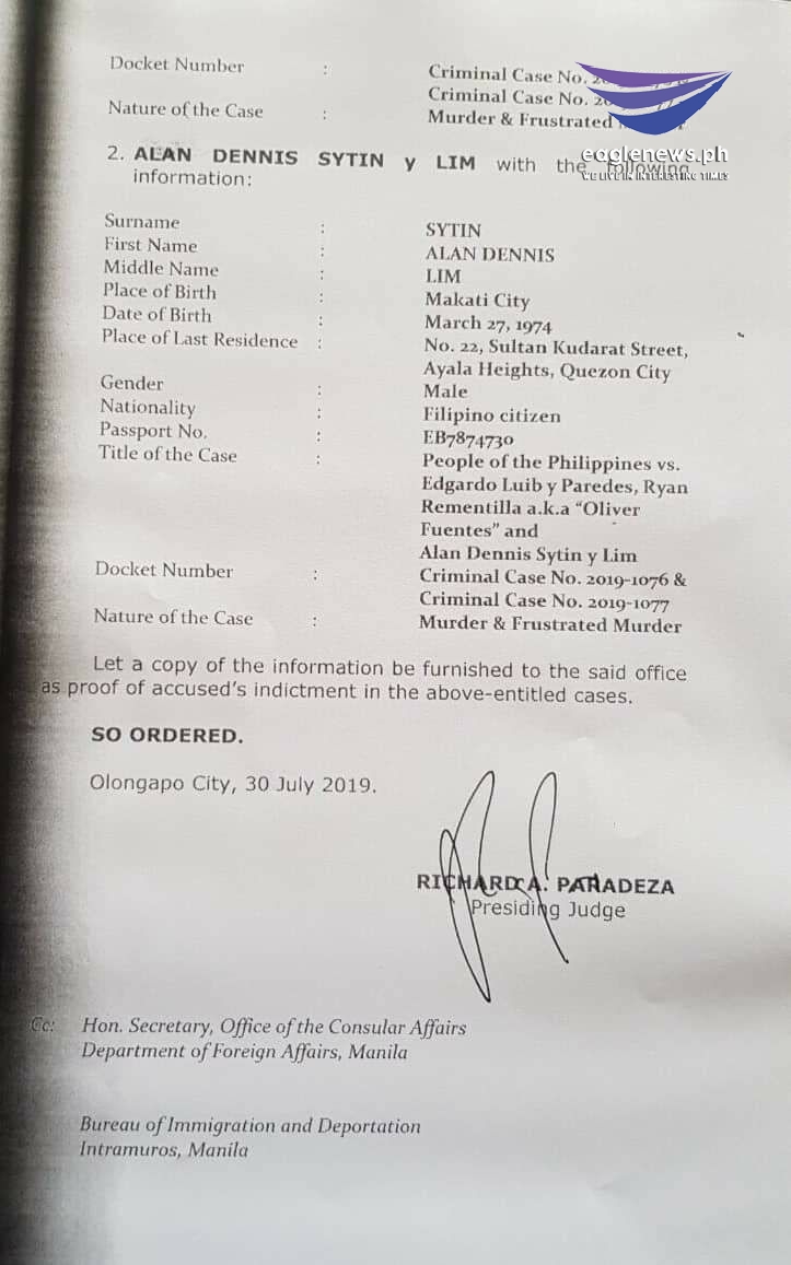 (Eagle News)--An Olongapo court has granted the motion for the issuance of a hold departure order against Dennis Sytin. Branch…