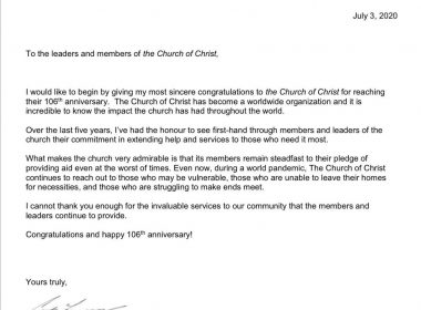 Member of Canadian Parliament congratulates Church Of Christ on its 106th year
