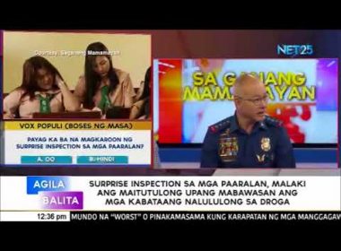 (Eagle News) — Maganda ang magiging epekto lalo na sa mga kabataan ang panukalang surprise inspection sa mga paaralan. Sa panayam kay Philippine National Police Director General Oscar Albayalde, sa murang edad ng mga batang mag-aaral ay namumulat na sila sa kapahamakang dulot ng ipinagbabawal na gamot sa kanilang kalusugan at maging sa buong komunidad. “Yung education dito na sa murang edad, dapat maeducate ang mga kabababayan. Ito yung tinatawag natin na “pag-asa ng bayan.” […]