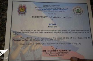 (Eagle News) – Ilocos Norte Provincial Police Office (INPPO) recognized the participation of members of SCAN International (also known as Society of Communicators And Networkers International) in giving information and assistance to motorists and tourists who regularly visit the province of Ilocos Norte. A certificate of recognition was given by INPPO led by Police Chief Inspector Dexter Corpuz, and Police Chief Inspector Randy Baoit. A ceremony for this was held at Camp Capt. Valentin Juan at exactly 8:00 yesterday. Members […]