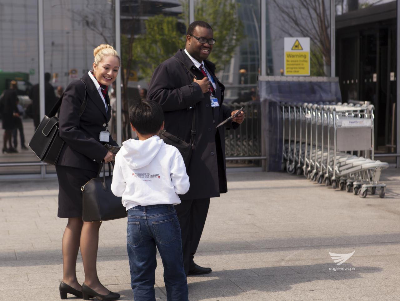 This young boy gets the attention of two airline personnel at the very busy Heathrow airport in London, England as he distributes pamphlets of the Iglesia Ni Cristo at the renowned airport.