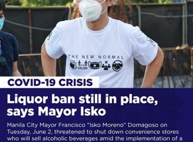 (Eagle News) – The liquor ban imposed over the city of Manila is still in place despite transition to general community quarantine, and business owners caught selling alcoholic beverages will face closure, the city’s mayor announced on Tuesday, June 2. “[A] liquor ban is still being implemented despite the city’s transition to General Community Quarantine”, Manila mayor Francisco “Isko Moreno” Domagoso said in the statement. Domagoso reminded owners of convenience stores, groceries, and other establishments […]