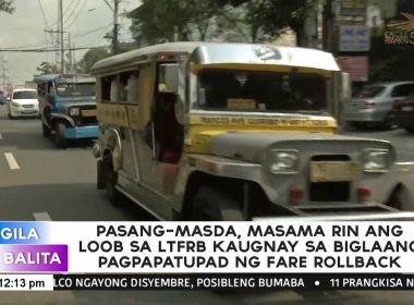 (Eagle News) — Masama rin ang loob ni Pasang Masda President Obet Martin sa naging paraan ng LTFRB sa pagbabawas ng pamasahe sa jeep. Ayon kay Martin, wala namang problema sa kaniya kung kailangan talagang magpatupad ng fare rollback pero dapat dumaan sa tamang proseso at hindi biglaan. Aniya sa halos isang taong paghihintay na ginagawa ng mga transport groups sa tuwing sila ay may kahilingang itaas ang pasahe ay hindi naman makatwiran na hindi […]