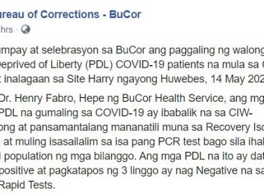 (Eagle News) — Eight inmates of the Correctional Institution for Women in Mandaluyong City have recovered from COVID-19. The Bureau of Corrections said the inmates tested negative in the PCR test and rapid test three weeks after they tested positive for the virus. Dr. Henry Fabro, chief of the BuCor Health Service, said the inmates will be brought back to the CIW, and will remain in the recovery isolation room, where they will undergo one […]