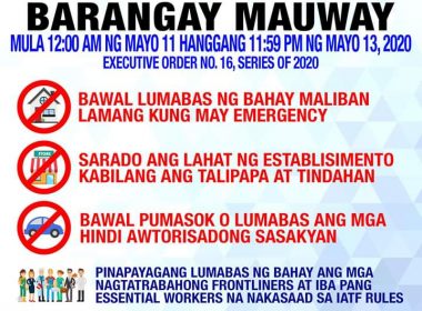 (Eagle News)–The total lockdown in Barangay Mauway in Mandaluyong City started today as the local government continued in its efforts to address COVID-19 which has so far infected over 10000 in the country. The lockdown, which will last until May 13, at 11:59 p.m., was based on Executive Order No. 16, series of 2020 issued by Mayor Menchie Abalos, and aims to allow the local government to conduct a rapid testing for the virus of […]
