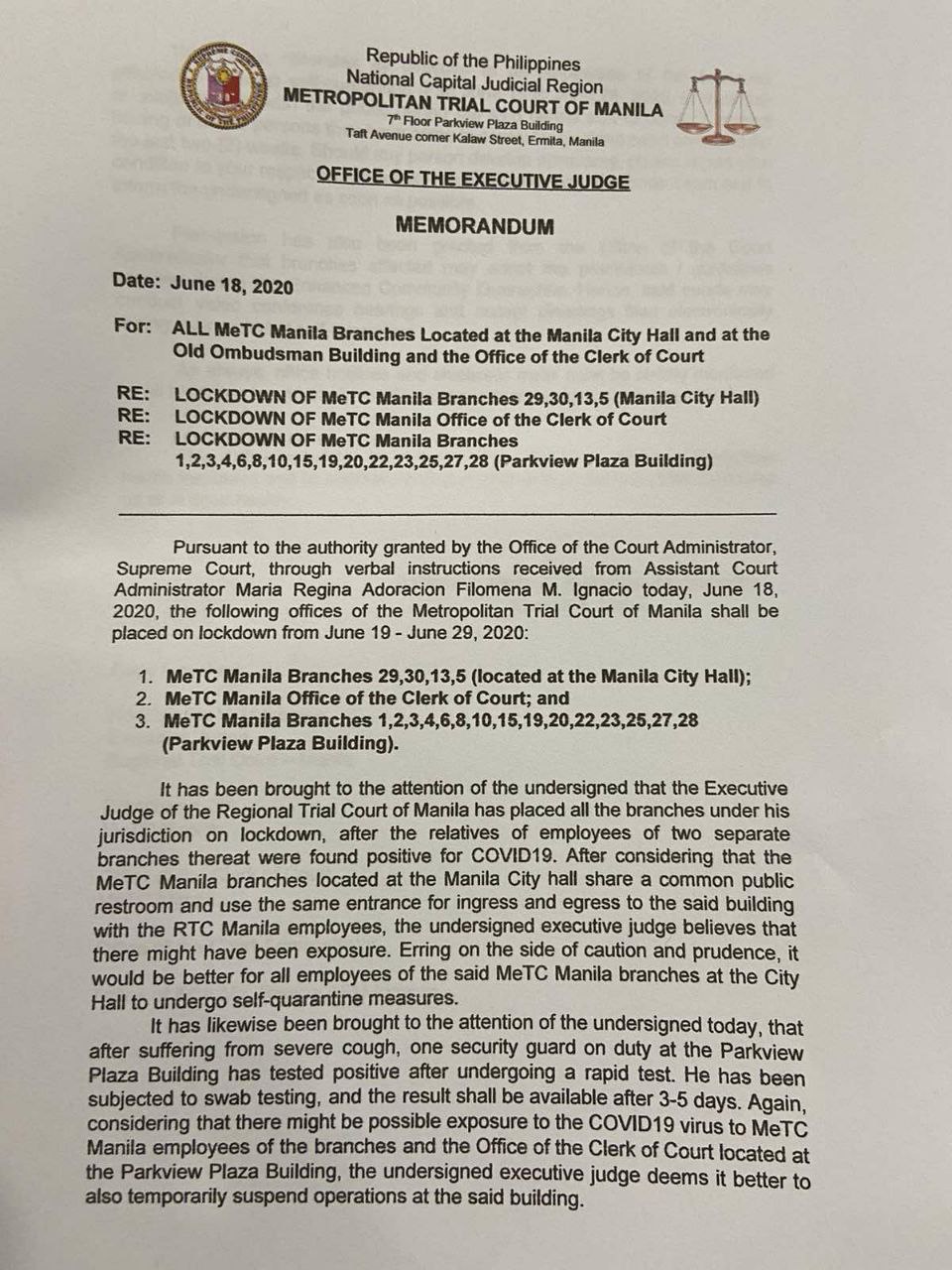 (Eagle News)--Several offices of the Manila Metropolitan Trial Court will be on lockdown starting today, June 19. A memorandum issued…