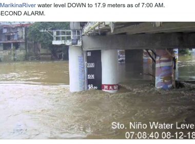 (Eagle News) — The water level in Marikina river continued to go down as the rains stopped Saturday night, August 11, and stood at 17.9 meters — below the 18-meter critical level — as of 7 a.m. Sunday, August 12, prompting the Marikina city government to lower the warning to second alarm from third alarm the previous night. The water level started going down after 10 p.m, Saturday. From a high point of 20.6 […]