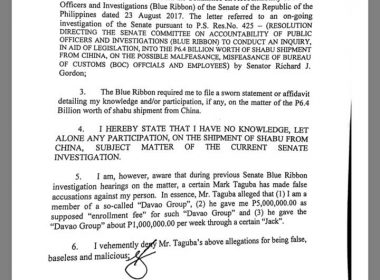 (Eagle News) — The Davao councilor being tagged as part of the supposed Davao Group engaged in illegal activities in the Bureau of Customs has denied the allegations against him. In an affidavit submitted to the Senate blue ribbon committee, Nilo “Small” Abellera said that he “ha(s) no knowledge, let alone any participation (in the entry) of the shabu shipment from China.” He was referring to the P6.4-billion drug shipment that entered the country via […]