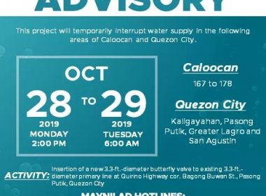 (Eagle News)–Some Maynilad Water customers in Caloocan and Quezon City should brace themselves for water service interruptions starting Monday, Oct. 28. In a statement, Maynilad said Barangays 167 to 178 in Caloocan and Barangays Kaligayahan, Pasong Putik, Greater Lagro and San Agustin in Quezon City will particularly be affected by the interruptions starting 2 p.m. Maynilad said the interruptions will end on Tuesday, Oct. 29, at 6 a.m. According to the water concessionaire, the disruptions […]