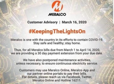 (Eagle News) — Public utilities are extending bill payment extensions in view of the Luzon-wide community quarantine imposed by the government to contain the spread of COVID-19. In a customer advisory released Monday, March 16, MERALCO announced that it will provide a 30-day payment extension for all electric bills due from March 1 to April 14, 2020. “Stay safe and healthy; stay home,” the MERALCO advisory stated, adding that customers may use its online and […]