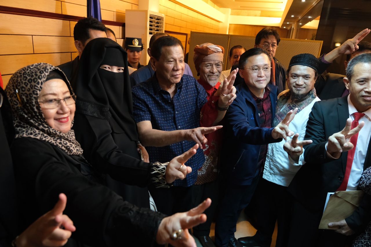 President Rody Duterte welcomes Moro National Liberation Front founding chairman Nur Misuari in a press conference in Malacañang on Thursday, November…