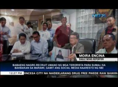 (Eagle News) – The National Bureau of Investigation has arrested a woman who allegedly recruits foreigners to join terrorist groups in Mindanao. Karen Aiza Hamidon, 36, was arrested in her house in Taguig City last October 11 by operatives of the NBI Counter Terrorism Division. The NBI found 296 posts made by the suspect. It said they were inciting rebellion in Marawi City.