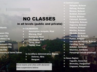 (Eagle News) — Classes on Thursday, August 16, were suspended in some areas as a result of flooding brought about by monsoon rains. Below is a list: Marikina — all levels Malabon — only schools in Barangay Dampalit (public and private) San Mateo, Rizal — all levels Calumpit, Bulacan — all levels Macabebe, Pampanga — all levels (public and private) Hagonoy, Bulacan — all levels (public and private), until Friday, August 17 Apalit, Pampanga — Paligui ES, Sampaloc ES, […]