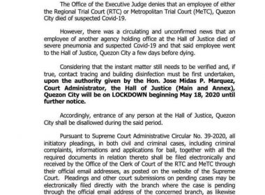 (Eagle News) — The Quezon City Hall of Justice is on lockdown starting today, May 18. While the Office of the Executive Judge, Cecilyn Burgos-Villavert, denied an employee of the QC Metropolitan Trial Court or the Regional Trial Court died of suspected COVID-19, she said there were “circulating and unconfirmed news that an employee of another agency holding office at the building died of severe pneumonia and COVID-19, and that said employee went to the […]
