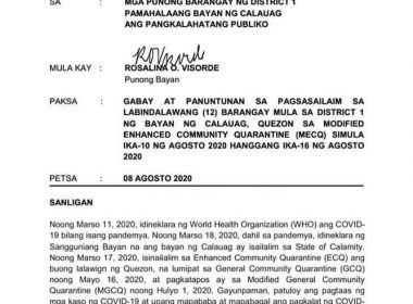 (Eagle News)–Twelve barangays in District I of Calauag, Quezon are under a modified enhanced community quarantine until Aug. 16. A memorandum from Mayor Rosalina Visorde said the these were placed under the MECQ since Aug. 10 following the continued rise in COVID-19 cases there. As of Aug. 8, the municipality had 30 cases, with 20 suspect cases. This was upon the recommendation of the Municipal Inter-Agency Task Force for Covid-19. Under the MECQ, the memorandum […]