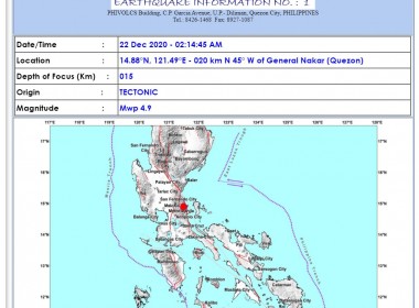 (Eagle News) — A magnitude 4.9 quake hit 20 kilometers northwest of General Nakar, Quezon province at 2:14 a.m. Tuesday, according to the Philippine Institute of Volcanology and Seismology. The tectonic quake was 15 kilometers deep and was also felt in Metro Manila. In its bulletin, Phivolcs said it is expecting aftershocks but no damages. The quake was also recorded by the US Geological Survey at magnitude 4.9. The USGS said its epicenter was […]