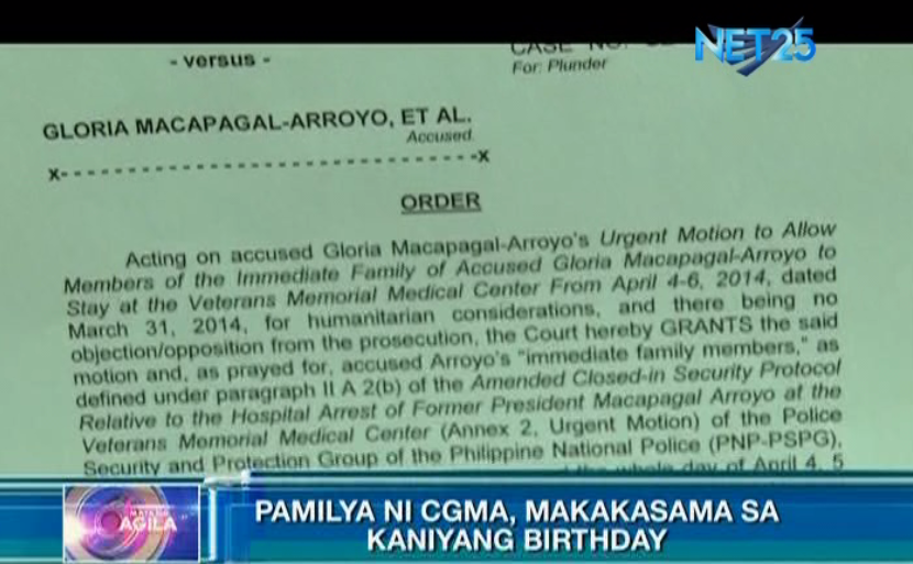 MANILA, Philippines — The Sandiganbayan on Wednesday, April 2, granted Pampanga Rep. Gloria Macapagal-Arroyo’s wish to have her family visit her on her birthday on April 5 at the Veterans Memorial Medical Center where she is currently detained. The former President will be turning 67 on April 5. She earlier asked the anti-graft court to allow her family to join her on her birthday at the VMMC for three days and two nights. Arroyo is […]