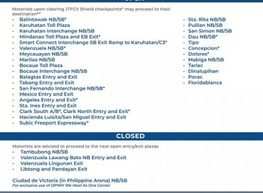 (Eagle News)–The North Luzon Expressway Corp. has released its list of operational toll plazas on NLEx and the Subic-Clark-Tarlac Expressway amid the enhanced community quarantine. NLEx Corp. said the list was as of Friday, May 1: NLEx Corp. said only Tambubong (northbound and southbound), Lawang Bato northbound entry and exit, Lingunan entry and exit, and Libtong and Pandayan exit are closed. The Ciudad de Victoria exit, both northbound and southbound, NLEx Corp. said, was open […]