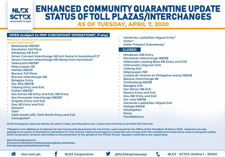 NLEx Corp. releases list of toll plazas on NLEx, SCTEx as of Tuesday, April 7
