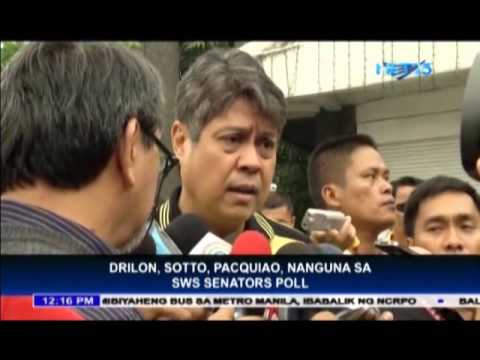 QUEZON City, Philippines – Senate President Franklin Drilon and Senator Tito Sotto are the top two candidates in the latest survey about senatorial preference conducted by the Social Weather Station. Taking the third place is Saranggani Representative Manny Pacquiao. (Eagle News Service Described by Jay Paul Carlos, Video Editing by Jericho Morales, Uploaded by MRFaith Bonalos)