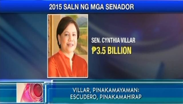 Eagle News — Inilabas na ng Senado ang kopya ng Statement Of Assets Liabilities at Net worth ng mga senador noong 2015. Sa dalawampu’t-apat na senador si Senadora Cynthia Villar pa rin ang naitalang pinakamayaman na may kabuuang assets na 3.5 billion pesos. Lumobo ang yaman ni Villar ng mahigit 1.6 billion mula sa dating 1.983 billion noong 2014, habang wala itong idineklarang anumang pagkakautang. Pumangalawa sa pinaka mayaman si Senador Ralph Recto na may […]