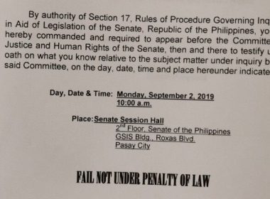 (Eagle News)–The Senate panel on justice and human rights has issued a subpoena against Bureau of Corrections chief Nicanor Faeldon for him to appear in the panel hearing on the Good Conduct Time Allowance law, or Republic Act 10592, on Monday, Sept. 2. Senator Richard Gordon, panel chair, signed the subpoena for Faeldon to testify on Saturday night. The subpoena was also signed by Senate President Tito Sotto. The hearing was set following outrage over […]