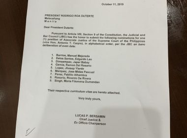 (Eagle News)–The Judicial and Bar Council has nominated nine people for the position of SC Associate Justice to President Rodrigo Duterte. Nominated for the post to be left vacant by Senior Associate Justice Antonio Carpio when he retires on Oct. 26 were Court of Appeals Associate Justices Manuel Mejorada Barrios, Edgardo Lao delos Santos, Japar Babay Dimaampao, Ramon del Rosario Garcia, Jhosep Ylarde Lopez, Pablito Alhambra Perez, Ricardo de Rivera Rosario, and Maria Filomena Dumandan […]