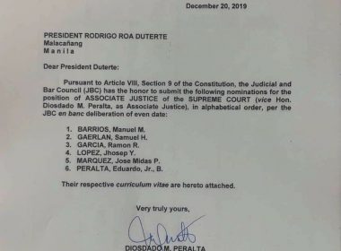 (Eagle News)-The Judicial and Bar Council has shortlisted five people to the post of associate justice in the Supreme Court. In the shortlist submitted to President Rodrigo Duterte were Manuel M. Barrios, Samuel M. Gaerlan, Ramon Garcia, Jhosep Lopez, Jose Midas Marquez and Eduardo Peralta Jr. Majority of those in the shortlist are CA justices: Gaerlan, Barrios, Garcia, Lopez and Peralta. Marquez is the Supreme Court administrator. The shortlist was signed by JBC chair Chief […]