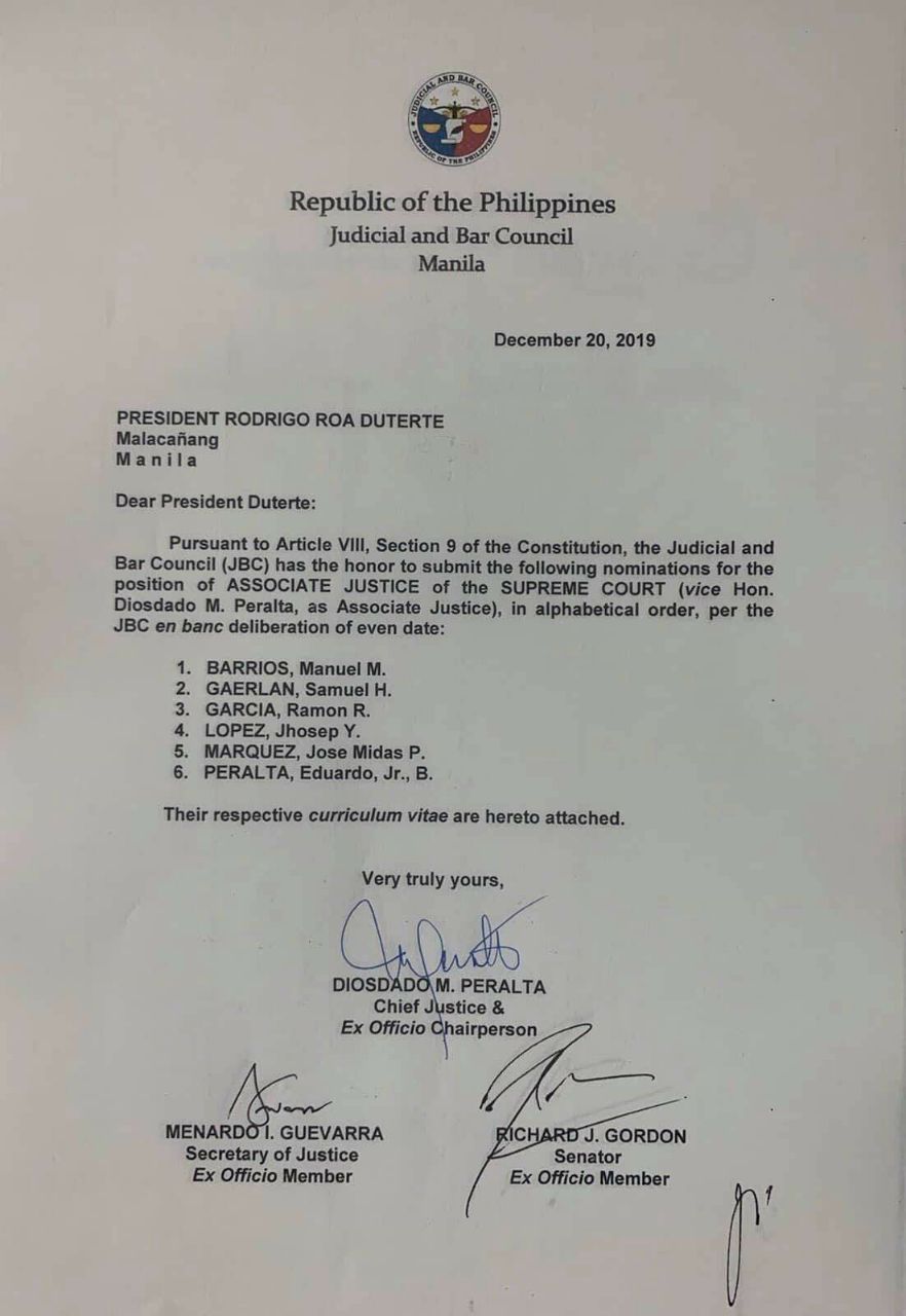 JBC submits shortlist of nominees to SC associate justice post to Duterte