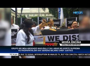 (Eagle News) — A group of lawyers on Tuesday, May 15, staged a protest in front of the Supreme Court to condemn the high court’s decision to oust Maria Lourdes Sereno from the chief justice post. Former Bayan Muna Representative Neri Colmenares, Atty. Edre Olalia and Free Legal Assistance Group chairman Jose Manuel Diokno joined the protest staged by the National Union of People’s Lawyer. Protesters wore black armbands and held up black posters to […]