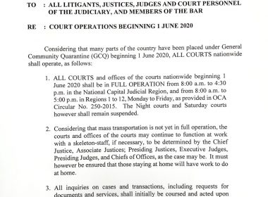 (Eagle News)–All courts shall begin full operations on June 1 but may continue to function with a skeleton workforce, the Supreme Court said on Friday, May 29. Chief Justice Diosdado Peralta said in administrative circular no. 41-2020 courts in the country shall be in full operation, from 8 a.m. to 4:30 p.m. in Metro Manila, and from 8 a.m. to 5 p.m. in Regions 1 to 12. The Chief Justice said the skeleton staff, if […]