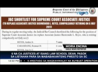 QUEZON City, Philippines (Eagle News) — Six justices of the Court of Appeals and a law school associate dean were included in the short list as possible replacements for Supreme Court Associate Justice Bienvenido L. Reyes, who will retire on July 6. The short list was released by the Judicial and Bar Council. Those in the shortlist are the following: 1.CA Presiding Justice Andres Reyes Jr. 2.CA Associate Justice Rosemari D. Carandang 3.CA Associate Justice […]