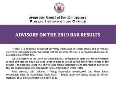(Courtesy: Supreme Court Public Information Office). Associate Justice Estela Bernabe, Chairperson of the 2019 Bar Examinations, belied reports circulating online that a certain date has been set for the release of the results. (Eagle News) – The Supreme Court of the Philippines belied reports that a definite date has been set for the release of the results of the 2019 Bar Examinations. In an advisory issued on April 2, Senior Associate Justice Estela Perlas-Bernabe, Chairperson […]