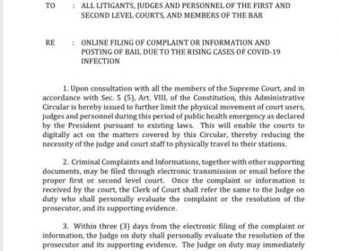 (Eagle News) – The Supreme Court of the Philippines will allow the online filing of complaints, information, and posting of bail in a bid to further limit the physical movement of court judges, users, and personnel amid the rising cases of COVID-19 in the country. In Administrative Circular No. 33-2020 issued March 31 by Chief Justice Diosdado Peralta, the high court outlined the procedure and reglementary periods to be observed in filing criminal complaints via […]