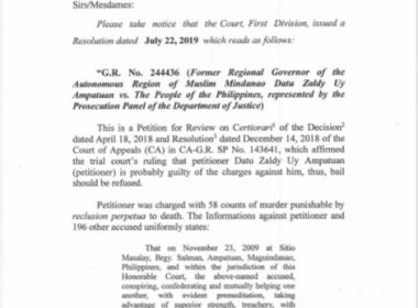(Eagle News)–The Supreme Court has affirmed a Court of Appeals decision upholding a lower court’s refusal to grant bail to former Autonomous Region in Muslim Mindanao governor Datu Zaldy Uy Ampatuan. In denying the petition for review on certiorari of Ampatuan, who faces 58 counts of murder over the Maguindanao massacre, the first division noted the “failure” of Ampatuan to “sufficiently show any reversible error” in the CA decision dated April 18, 2018 and the […]