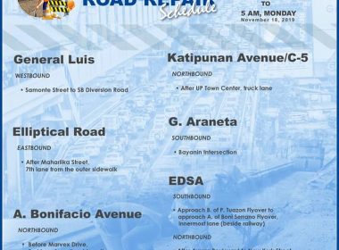 (Eagle News)–The Department of Public Works and Highways advised motorists to avoid several roads in Metro Manila as reblocking and sewer construction activities, and repairs continue. Below is a list: SOUTHBOUND: 1. A. Bonifacio Ave. Cloverleaf to 11th Ave. (1st lane from sidewalk) 2. EDSA Bulakan St. to West Ave. (3rd lane from sidewalk) 3. EDSA approaching BP Tuazon flyover towards A. Boni Serrano flyover (2nd lane from MRT Line) WESTBOUND: 4. General Luis St., […]