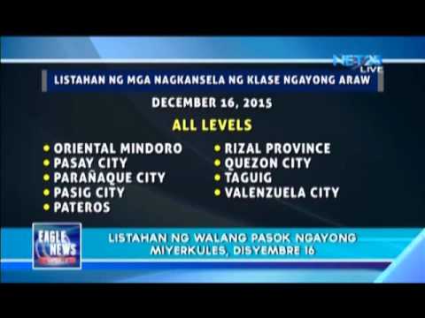 (Eagle News) — Here is the updated list of class suspensions (based on announcements made by various local government units and the Department of Education) because of Typhoon Nona All Levels: Batangas, Rizal, Cavite, Laguna, Oriental Mindoro, Bataan, Metro Manila Caloocan City Las Pinas City Makati City Malabon City Mandaluyong City Manila Marikina City Muntinlupa City Navotas City Paranaque City Pasay City Pasig City Pateros Quezon City San Juan City Taguig City Valenzuela City Bocaue, […]