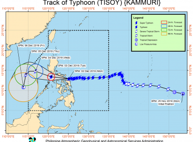 (Eagle News)–Typhoon “Kammuri” has slightly slowed down as it approached the Philippine Area of Responsibility on Saturday, Nov. 30. The Philippine Atmospheric Geophysical and Astronomical Services Administration said “Kammuri,” which has maintained its strength, was so far located 1,220 kilometers east of Southern Luzon, and is expected to enter PAR between today and tomorrow. “Kammuri,” which will be called “Tisoy” once it enters PAR, is packing maximum sustained winds of 150 kph near the center […]