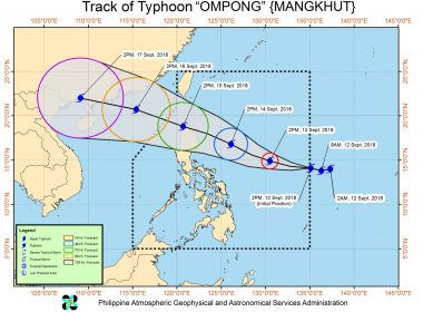 (Eagle News) – The country’s weather bureau has placed Catanduanes under tropical cyclone warning signal number one after supertyphoon “Ompong” (international name: Mangkhut) entered the country Wednesday afternoon, Sept. 12. “Ompong” has maximum sustained winds of up to 205 kilometers per hour near the center and gusts of up to 255 kph. It is expected to further intensify as it moves nearer Luzon. PAGASA warned that Ompong could have windspeeds comparable to those of […]