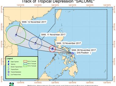 (Eagle News) — Tropical Depression “Salome” slightly intensified on Thursday as it moved toward Ticlao Island in Masbate. In its 11 a.m. advisory, the Philippine Atmospheric, Geophysical and Astronomical Services Administration said there will be moderate to heavy rainfall within the 250-kilometer diameter of “Salome.” As of 10 a.m., PAGASA said the center of “Salome,” which is packing maximum winds of up to 55 kilometers per hour near the center and gustiness of up to […]