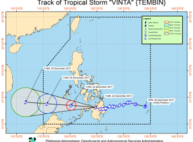(Eagle News) — Tropical Storm “Vinta” further weakened as it moved toward the Misamis Occidental-Zamboanga del Norte area on Friday afternoon. In its 2 p.m. advisory, the Philippine Atmospheric Geophysical and Astronomical Services Administration said the center of “Vinta” was in the vicinity of Marawi City in Lanao del Sur as of 1 p.m. The tropical storm is packing maximum sustained winds of 65 kilometers per hour near the center and gustiness of up to 110 […]