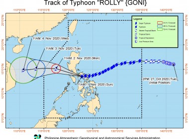 (Eagle News) – Tropical Cyclone Rolly (Goni) has weakened into a typhoon and is now off the coast of Pasacao, Camarines Sur. With the weakening of Rolly, typhoon signal no. 5 in Camarines Sur and Albay was downgraded into signal no. 4. PAGASA said “catastrophic violent winds and intense to torrential rainfall associated with the region of the eyewall and inner rainbands of the typhoon is prevailing or expected within the next 12 hours over […]