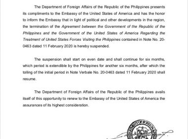 (Eagle News)–The Philippines has suspended the termination of the Visiting Forces Agreement, Foreign Affairs Secretary Teodoro Locsin Jr. said. According to a diplomatic note issued to US Ambassador Sung Kim and posted on the Foreign Affairs Secretary’s Twitter account, the suspension of the termination of the agreement, which governs the conduct of US forces who take part in military exercises in the Philippines, was “in light of the political and other developments in the region.” […]